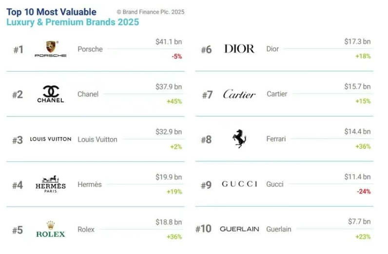 2025全球高档和奢侈品牌价值50强,保时捷、香奈儿、路易威登、爱马仕、劳力士排名前五