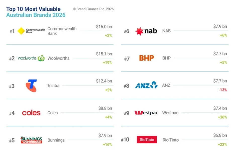 2026澳大利亚品牌价值100强榜单